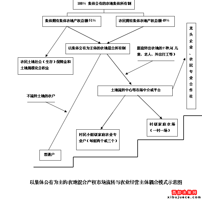 李錄堂向《西部大開發(fā)》介紹,董家?guī)X村示范項(xiàng)目探索建立“以土地集體公有為主,非集體(農(nóng)民)土地所有為輔”的土地集體公有制,通過土地承包經(jīng)營控制權(quán)比例化市場流轉(zhuǎn)試驗(yàn),組建土地股份合作社、家庭農(nóng)場和專業(yè)大戶等經(jīng)營主體,實(shí)行規(guī)?;s化經(jīng)營,進(jìn)而科學(xué)地解決人多地少條件下土地產(chǎn)權(quán)市場化可能產(chǎn)生的社會不穩(wěn)定因素以及農(nóng)民農(nóng)地產(chǎn)權(quán)自由進(jìn)入和退出問題,讓農(nóng)民“退出土地”有保障,“進(jìn)入土地”有支持,徹底消除農(nóng)民流轉(zhuǎn)土地的后顧之憂,形成“以公有制為主體具有雙重保障的農(nóng)地市場流轉(zhuǎn)機(jī)制”。這一農(nóng)村土地改革的新思路是遵照“以公有制為主體,多種所有制經(jīng)濟(jì)成分并存”的《憲法》原則,借鑒國有企業(yè)劃分國有股、企業(yè)股和企業(yè)全員持股的經(jīng)驗(yàn)及城鎮(zhèn)住房公積金改革的做法,將農(nóng)地產(chǎn)權(quán)(農(nóng)地承包經(jīng)營使用權(quán)等)在集體和農(nóng)民之間按集體占51%,農(nóng)民占49%的比例混合分配后再市場化流轉(zhuǎn)。其中集體所占農(nóng)地產(chǎn)權(quán)及收益總額的51%主要用于農(nóng)民土地社會保障金和農(nóng)地規(guī)?;e金,以解決農(nóng)地市場流轉(zhuǎn)過程中失地失業(yè)農(nóng)民的生存和就業(yè)保障問題,其余49%的收益歸農(nóng)民個人所有,進(jìn)而形成既能保證農(nóng)地集體所有制主導(dǎo)地位,又具有雙重保障和穩(wěn)定性的農(nóng)地產(chǎn)權(quán)市場流轉(zhuǎn)機(jī)制。