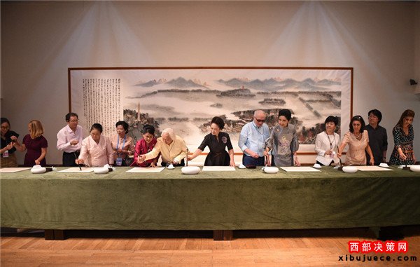 在觀看“意象中國”書畫展時,彭麗媛和來賓們在《西溪紀勝圖》、《朱荷圖軸》等經典國畫作品前駐足觀看,接著欣賞4位著名書畫家現場聯袂創(chuàng)作書畫作品《江南憶》。一位書法家還為來賓們現場示范毛筆的執(zhí)筆、運筆方式。彭麗媛邀請來賓們一同書寫漢字“和”。她說,“和”字在漢語里具有“和平”、“和諧”之義,是我們對世界的共同心愿。來賓們饒有興致地拿起毛筆各自書寫,并展示自己的書法作品。彭麗媛說,昨晚各位在西湖邊觀看了精彩的文藝演出,今天我們在這里一同欣賞畫中的西湖。她同來賓們在國畫《西湖秋勝》前合影留念。