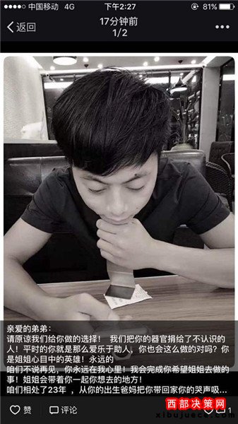 據(jù)了解,22歲的吳遠旋在東莞鳳崗工作。9月3日凌晨五點,他騎摩托車送友人上班時,不幸發(fā)生車禍,導致重度顱腦外傷,達到腦死亡狀態(tài)。家屬召開家庭會議后,決定把吳遠旋所有的重要器官捐獻出來,救助他人。