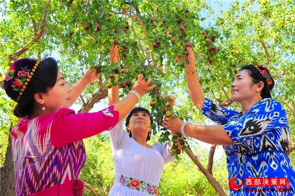 五堡鎮(zhèn)拉甫喬克村的棗農(nóng)熱孜瓦古麗·卡德爾(左)和前來(lái)幫忙的鄰居交談。