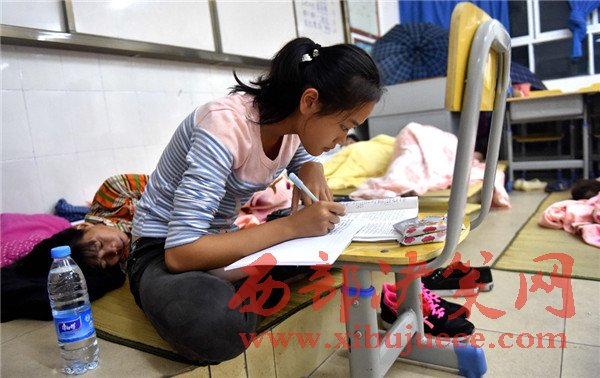10月18日,在欽州市的臨時安置所內(nèi),高一學(xué)生廖凌在寫作業(yè)。