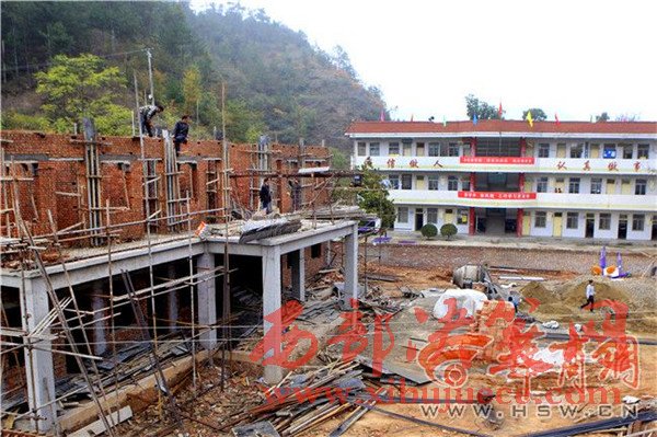 10月20日上午,在山陽縣高壩店鎮(zhèn)石橋村小學(xué),偌大的操場中間用一堵墻隔成兩半,一半是學(xué)生活動場所,另一半是一棟剛剛建設(shè)的村委會辦公樓。學(xué)校的一、三樓用于村委會、教職工辦公休息,二層學(xué)生上課。