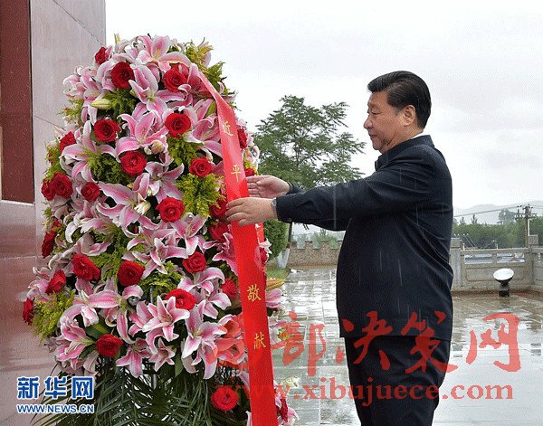 2016年7月18日至20日,中共中央總書記、國家主席、中央軍委主席習(xí)近平在寧夏調(diào)研考察。這是7月18日上午,習(xí)近平在固原市西吉縣將臺堡向紅軍長征會師紀念碑敬獻花籃。新華社記者李濤攝