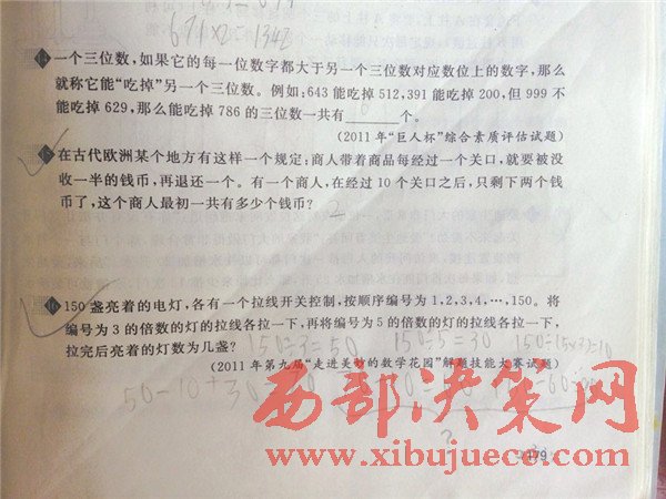 “150盞亮著的電燈,各有一個(gè)拉線開關(guān)控制,被順序編號(hào)為1,2,3,4,…,150。將編號(hào)為3的倍數(shù)的燈的拉線各拉一下,再將編號(hào)為5的倍數(shù)的拉線各拉一下,拉完后亮著的燈數(shù)為幾盞?”這是一道考公因數(shù)和公倍數(shù)的思維數(shù)學(xué)題,今年暑假,才上完三年級(jí)的羅弋在做四年級(jí)的數(shù)學(xué)競(jìng)賽題集《培優(yōu)新幫手》時(shí)遇到此題,算出答案“90”與標(biāo)準(zhǔn)答案“80”不符,媽媽陳群只當(dāng)兒子錯(cuò)了。