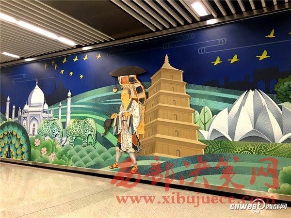 大雁塔站的文化墻也與大雁塔相關(guān),除了設(shè)計有菩提樹、天竺佛光外,還有大雁塔和唐僧等。