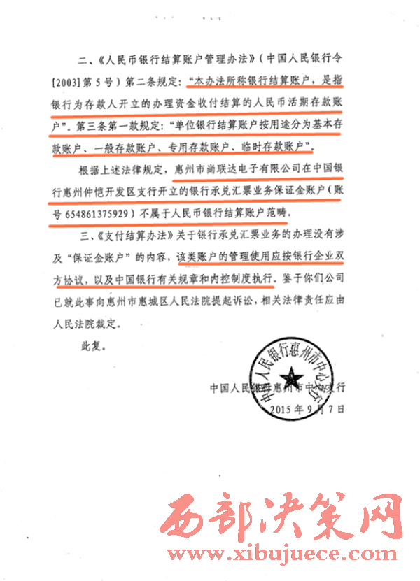 人行惠州分行則認(rèn)定,涉案保證金賬戶(hù)不屬于人民幣銀行結(jié)算賬戶(hù)管理范籌,無(wú)需經(jīng)當(dāng)?shù)厝嗣胥y行核準(zhǔn)和備案,保證金賬戶(hù)的資金劃轉(zhuǎn)、使用在不違反國(guó)家法律、法規(guī)的前提下,由銀行和單位協(xié)商,按協(xié)議辦理。