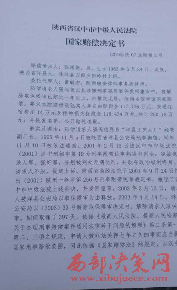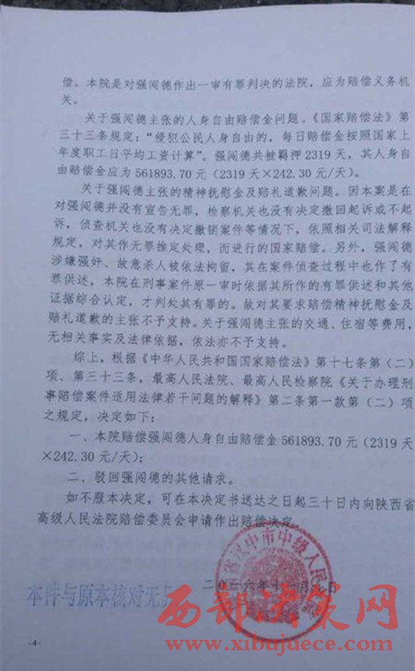 2016年11月9日,陜西省漢中市中級(jí)人民法院作出國(guó)家賠償決定,國(guó)家賠償書上說,根據(jù)《中華人民共和國(guó)國(guó)家賠償法》的有關(guān)規(guī)定,決定賠償強(qiáng)闖德561893.70元。(強(qiáng)闖德共被羈押2319天,每天按242.30元賠償)。而對(duì)于強(qiáng)闖德提出的交通、住宿等費(fèi)用,以及精神賠償?shù)纫螅挥柚С帧?/span>