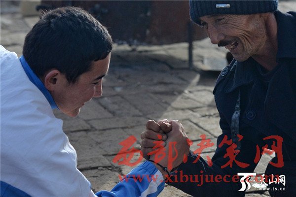 吐爾汗巴衣用手走路四十年,使得胳膊粗壯有力,工人們調(diào)侃父子倆,扳手腕誰能贏?