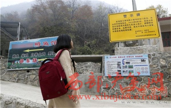 昨日上午,華商報(bào)記者來(lái)到王莽街道小峪河村涉事農(nóng)家樂,該農(nóng)家樂仍在正常營(yíng)業(yè)。在農(nóng)家樂門口,立著一個(gè)很顯眼的黃色警示牌,是長(zhǎng)安區(qū)防汛抗旱指揮部辦公室設(shè)置的,上面寫著2015年8月3日突發(fā)山洪造成九人死亡的事情,并提醒群眾遠(yuǎn)離河道,雨天不得在溝口逗留,不得在此亂搭亂建,該牌子。在警示牌下面,有一條用水泥砌成的水溝,從路邊一直通往山上,華商報(bào)記者注意到,在山坡上有水向下流出。