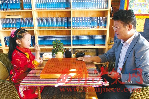 西藏自治區(qū)藏棋協(xié)會(huì)秘書長阿旺邊巴正在與孩子下棋。