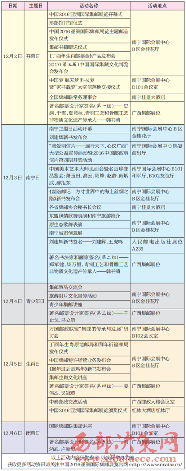中國2016亞洲國際集郵展覽即將于12月2日—6日在南寧舉行,除了精彩的競賽性和非競賽性展品,郵展期間還將舉辦生肖郵票展示和主題郵局展示等相關(guān)活動(dòng)。展會(huì)還特別設(shè)定了開幕日、南寧日、青少年日、生肖日、閉幕日五個(gè)主題日,下面就來看看每個(gè)主題日都有哪些豐富的活動(dòng)吧。