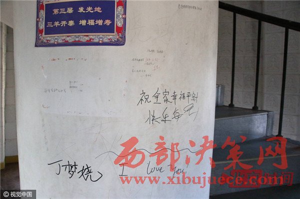 日前,向游客免費開放的山東省無棣縣大覺寺海豐塔內(nèi)壁遭到游客涂鴉,幾乎每一層內(nèi)墻壁都被刻滿了情話和祝福語,連墻壁裝飾的佛像圖畫都不能幸免。圖為海豐塔內(nèi)壁遭游客涂鴉,刻滿了情話和祝福語。