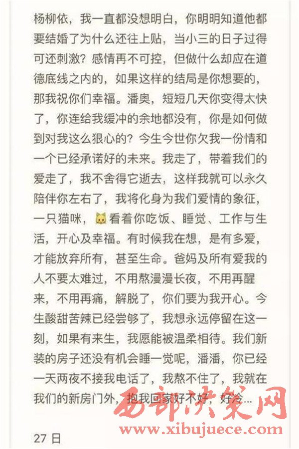 次日凌晨1點(diǎn)20分,段丹峰在朋友圈發(fā)布長(zhǎng)文,表達(dá)因感情問(wèn)題意欲輕生,并配有一張與潘奧相擁的親密合影。在朋友圈中,段丹峰寫(xiě)道,潘奧有新歡楊某,短短幾 天變化太快,沒(méi)有給她留下緩沖的余地,潘奧已經(jīng)一天兩夜沒(méi)接她電話,自己此刻正在新房外。據(jù)段丹峰朋友介紹,與潘奧的合影正是今年9月初,兩人去給朋友當(dāng) 伴郎伴娘,在別人婚禮上,潘奧曾向她求婚。