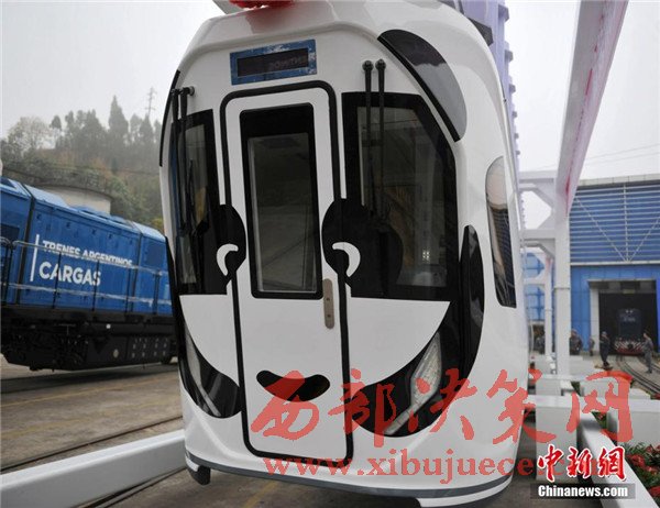 記者在現(xiàn)場看到,正式下線的空鐵車身為卡通熊貓山水圖案,酷似“熊貓”,每列定員144人,時速最高可達65公里。列車采用“大容量動力蓄電池充放電控制技術(shù)”,通過實現(xiàn)高倍率放電,提高列車起動加速性能及對極限環(huán)境的適應(yīng)性,同時能將400千瓦的電制動功率全部用于動力電池快速充電,實現(xiàn)制動能量回收再利用,延長蓄電池續(xù)航里程達120千米。圖為車身外繪制有熊貓山水圖案。