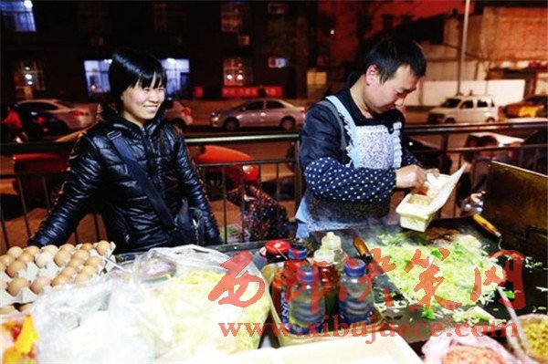 同樣是炒面,河南的楊氏夫婦賣的則是“鐵板炒”,在這個(gè)夜市攤干了近4年,每天倆人同出同進(jìn),朝夕相處,“有老婆在身邊,干活兒更有動力,做生意也更和諧,更溫情。”