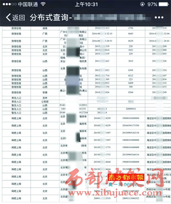 12月8日,南都記者以了解親戚結(jié)婚對(duì)象為由,聯(lián)系上一家名叫“××商貿(mào)”的服務(wù)商,工作人員介紹,只需提供身份證號(hào)碼,即可查詢包括開房記錄、列車記錄、航班記錄、網(wǎng)吧記錄、出境記錄、入境記錄、犯罪記錄、住房記錄、租房記錄、銀行記錄、駕駛證記錄等11個(gè)項(xiàng)目在內(nèi)的材料,統(tǒng)稱“身份證大軌跡”。