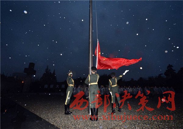 12月13日,江蘇省南京市,清晨7時,五星紅旗從國旗桿頂部開始緩緩下降,降至半旗位置固定。