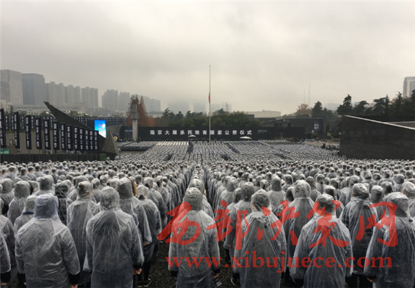 12月13日,十時整,雨中,南京大屠殺死難者國家公祭儀式在南京大屠殺遇難同胞紀(jì)念館隆重舉行。8000人冒雨參加了公祭,向30萬遇難同胞致哀,場面莊嚴(yán)肅穆。國家公祭儀式從上午10點(diǎn)正式開始,南京全城鳴笛致哀。