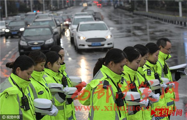 在南京市中心新街口,十點(diǎn)整,隨著凌厲尖銳的防空警報在南京上空拉響,往日熙攘熱鬧的新街口變得靜止。車輛緩緩?fù)W?,主動鳴笛致哀1分鐘。行色匆匆的路人也停下腳步在寒風(fēng)中低頭默哀。此刻,所有人共同緬懷在南京大屠殺中死難的同胞。