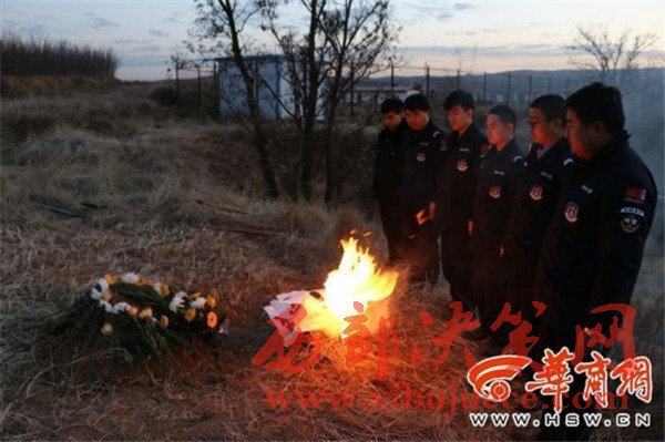 12月8日,府谷縣公安局警犬訓(xùn)導(dǎo)隊(duì)警犬“湯姆”在府谷縣新民鎮(zhèn)執(zhí)行安全隱患排查任務(wù)回到駐地進(jìn)食后出現(xiàn)腹部膨脹的狀況,經(jīng)犬醫(yī)醫(yī)治無效于當(dāng)晚死亡。12月9日,府谷縣公安局警犬訓(xùn)導(dǎo)隊(duì)警察為這個“特殊的戰(zhàn)友”舉行了簡樸的葬禮,他們“愿無言的戰(zhàn)友,一路走好。”