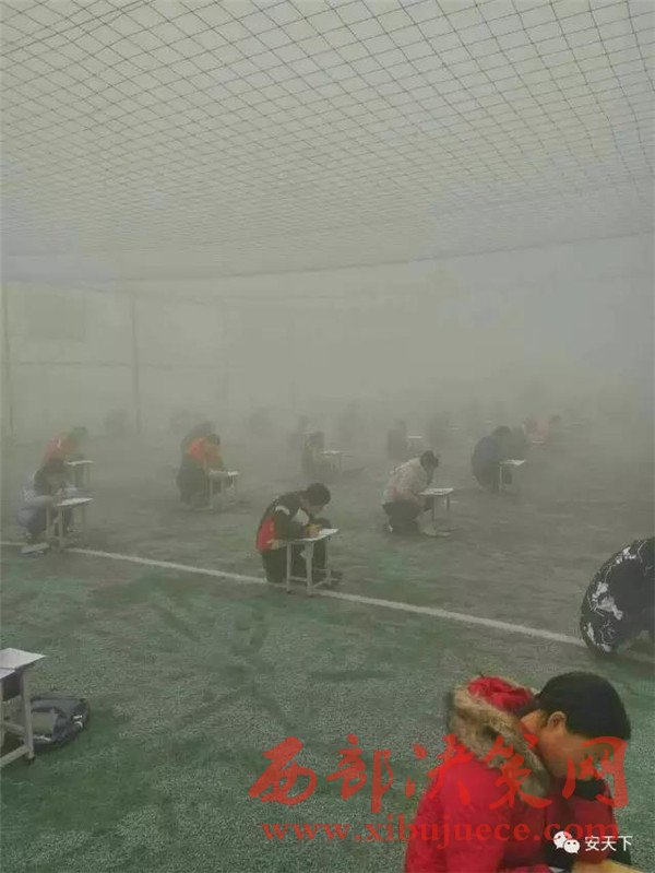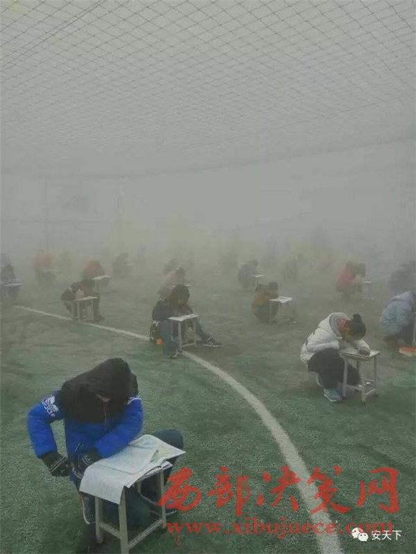 投訴人閆先生給記者發(fā)來兩張照片,照片顯示,天氣灰蒙蒙的,在一個露天的足球場上,很多學(xué)生半蹲著趴在凳子上做卷子,由于霧霾太大,第2排后面的學(xué)生身影已經(jīng)很模糊。20日下午3時50分左右,大河報記者趕到林州,當(dāng)?shù)氐目諝忪F霾十分嚴(yán)重,能見度只有二三百米。在臨淇鎮(zhèn)一中學(xué)校附近,記者見到了閆先生。他告訴記者,現(xiàn)在學(xué)校已經(jīng)知道記者要來采訪了,臨時放假了,考試也取消了。隨后,在校門口,該校八年級的一名學(xué)生告訴記者,學(xué)校確實確實在12月19日考試了,上午考英語和數(shù)學(xué),下午考語文和物理。該學(xué)生告訴記者,八年級共十個班,每個班六七十人,大家都參加了考試,“在操場上考的,搬著凳子在外面”。