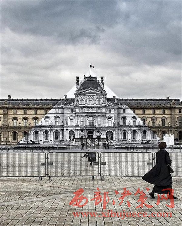 利用攝影技術(shù),法國街頭藝術(shù)家JR讓巴黎盧浮宮前著名的玻璃金字塔消失了。當(dāng)從一個(gè)精確的角度看過去,金字塔真的不見了,我們得以見到盧浮宮驚人的“真面目”。