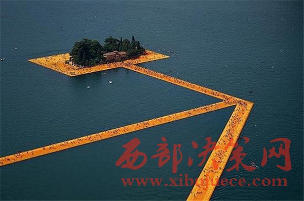 當(dāng)代概念藝術(shù)家Christo因開拓土地藝術(shù)而聞名。在他最新的項(xiàng)目漂浮碼頭中,Christo搭建了很多亮黃色的小路,邀請意大利Sulzano的居民和游客步行通勤至別的導(dǎo)語。和Christo的其他裝置一樣,漂浮碼頭作品中的其他地方景觀也扮演著重要的角色。“湖周圍的山脈提供了鳥瞰該作品的地點(diǎn),展現(xiàn)了那些之前沒被注意的角度”,他解釋道。“水、風(fēng)、太陽,都是這個(gè)項(xiàng)目的一部分。”