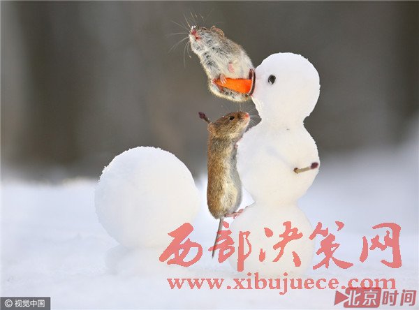 圖為饞嘴田鼠吃小雪人的"鼻子"