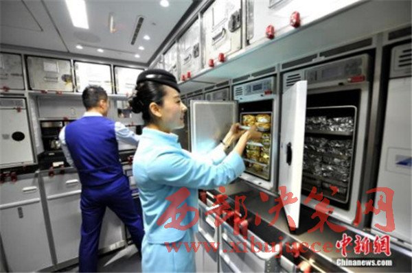圖為空乘在飛機(jī)上整理烤箱內(nèi)的食物。