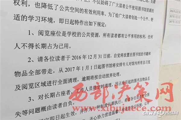 記者看到就在圖書(shū)館的入口貼著圖書(shū)館關(guān)于清理閱覽室座位的通知,上門(mén)寫(xiě)著因?yàn)轲^內(nèi)占座問(wèn)題屢禁不止,請(qǐng)同學(xué)們?cè)?2月31號(hào)前將自己的物品帶走,從1月1號(hào)起將全面清理閱覽室,通知貼出的時(shí)間是12月28號(hào)。