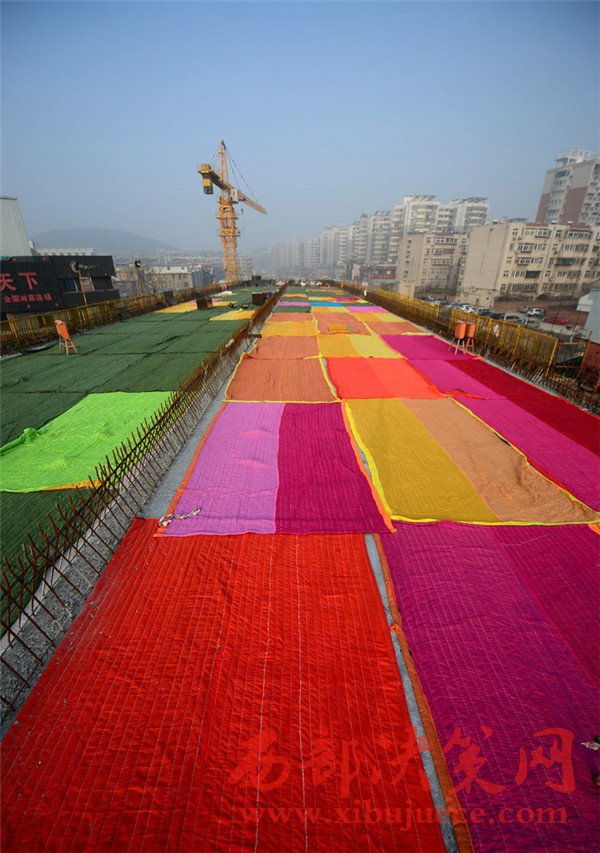 2017年1月2日,濟南,在七里山路附近的順河高架橋南延施工現(xiàn)場,百余米長的高架橋路面鋪設(shè)了彩色的棉被,總數(shù)達到100多條,覆蓋面積約2000多平方米 。據(jù)了解,該段高架橋為新澆筑的箱梁,為確保冬季低溫下混凝土能夠保證強度和防凍,施工采取多種保暖法,為路面蓋棉被取暖。