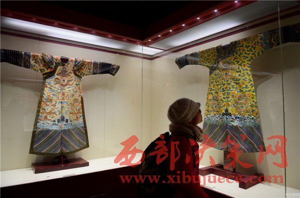 2017年01月05日,遼寧省沈陽市,沈陽故宮博物院舉行“錦繡華彩—院藏清宮織繡展”,清朝皇帝冬季朝袍首次亮相。沈陽故宮是中國僅存的兩大古代皇家宮殿建筑群之一,為清朝初期努爾哈赤和皇太極的宮殿,距今近400年歷史,貯藏近20萬件清宮御用物品和內(nèi)府秘籍。清明黃江綢繡金龍出鋒夾朝袍。