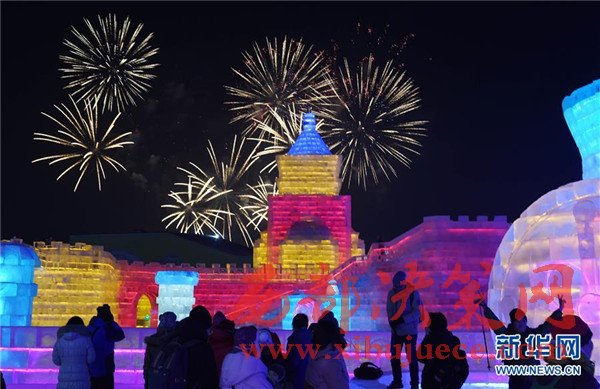 1月5日,禮花在哈爾濱冰雪大世界上空綻放