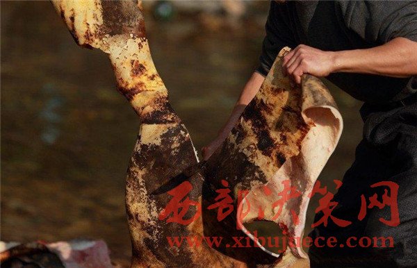 燒好的大黃牛,皮都已經(jīng)焦黃,遠(yuǎn)遠(yuǎn)的都能聞到一股燒焦的氣味。放到水里洗干凈,然后由專人開膛破腹。