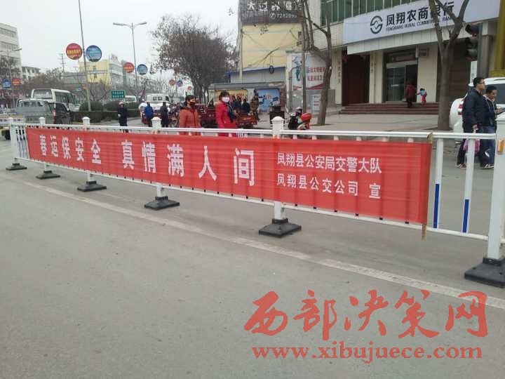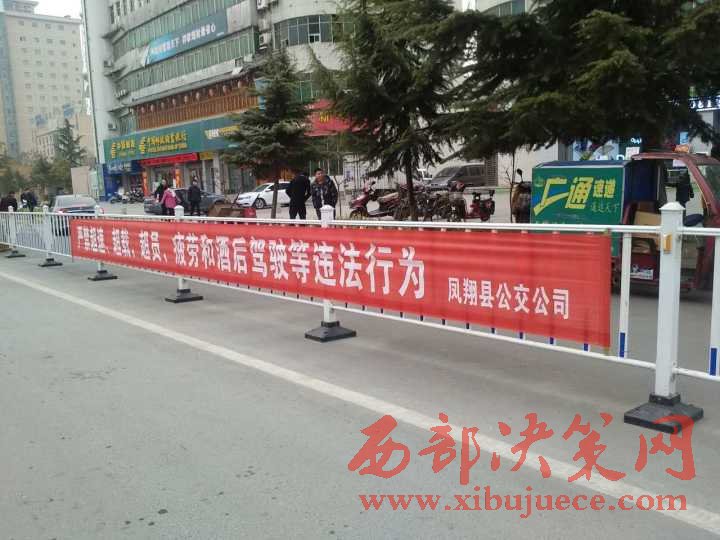 西部決策網(wǎng)訊(帥華鋒 李亮亮 通訊員 孟歡)為切實做好2017年春運期間道路交通安全宣傳工作,引導(dǎo)群眾安全、文明出行,營造和諧、平安的春運道路交通安全氛圍。近日,鳳翔大隊根據(jù)汽車客運站、鎮(zhèn)街要道春運期間人流車流量較大的特點,將印有“文明交通你我他,平安出行靠大家”、“祝千家萬戶家家團圓 愿四方旅客路路平安”、“秩序保障安全,規(guī)則守護(hù)生命”、“滴酒不沾,一路平安”等交通安全宣傳標(biāo)語的橫幅懸掛在東大街、南大街、東大街、秦鳳路等主干道防護(hù)欄醒目位置,為春運安全行駛營造濃厚的宣傳氛圍。