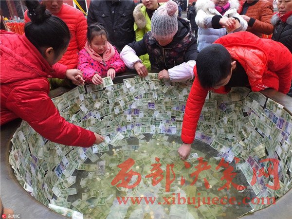 2017年2月,正月迎財神、拜財神。在湖北宜昌當陽玉泉寺,眾多香客向玉泉寺內(nèi)的巨型銅缸里投幣、在銅缸壁上貼幣祈福。