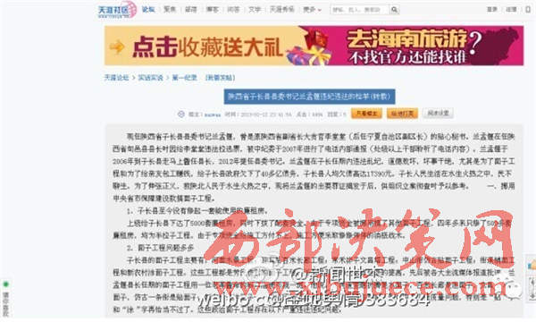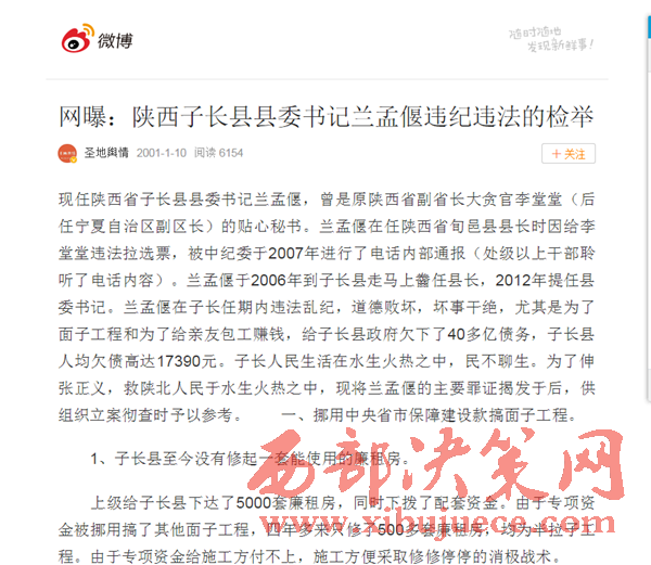 據(jù)微博網(wǎng)友爆料:現(xiàn)任陜西省子長縣縣委書記蘭孟偃,曾是原陜西省副省長大貪官李堂堂(后任寧夏自治區(qū)副區(qū)長)的貼心秘書。蘭孟偃在任陜西省旬邑縣縣長時因給李堂堂違法拉選票,被中紀(jì)委于2007年進(jìn)行了電話內(nèi)部通報(bào)(處級以上干部聆聽了電話內(nèi)容)。蘭孟偃于2006年到子長縣走馬上齤任縣長,2012年提任縣委書記。蘭孟偃在子長任期內(nèi)違法亂紀(jì),道德敗壞,壞事干絕,尤其是為了面子工程和為了給親友包工賺錢,給子長縣政府欠下了40多億債務(wù),子長縣人均欠債高達(dá)17390元。子長人民生活在水生火熱之中,民不聊生。為了伸張正義,救陜北人民于水生火熱之中,現(xiàn)將蘭孟偃的主要罪證揭發(fā)于后,供組織立案徹查時予以參考。 一、挪用中央省市保障建設(shè)款搞面子工程。