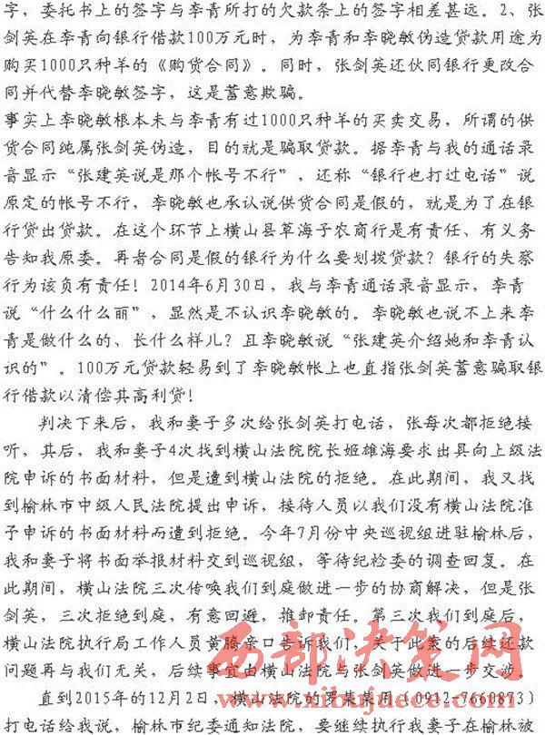 判決下來(lái)后,我和妻子多次給張劍英打電話,張每次都拒絕接聽,其后,我和妻子4次找到橫山法院院長(zhǎng)姬雄海要求出具向上級(jí)法院申訴的書面材料,但是遭到橫山法院的拒絕。在此期間,我又找到榆林市中級(jí)人民法院提出申訴,接待人員以我們沒(méi)有橫山法院準(zhǔn)予申訴的書面材料而遭到拒絕。今年7月份中央巡視組進(jìn)駐榆林后,我和妻子將書面舉報(bào)材料交到巡視組,等待紀(jì)檢委的調(diào)查回復(fù)。在此期間,橫山法院三次傳喚我們到庭做進(jìn)一步的協(xié)商解決,但是張劍英,三次拒絕到庭,有意回避,推卸責(zé)任。第三次我們到庭后,橫山法院執(zhí)行局工作人員黃騰親口告訴我們,關(guān)于此案的后續(xù)還款問(wèn)題再與我們無(wú)關(guān),后續(xù)事宜由橫山法院與張劍英做進(jìn)一步交涉。