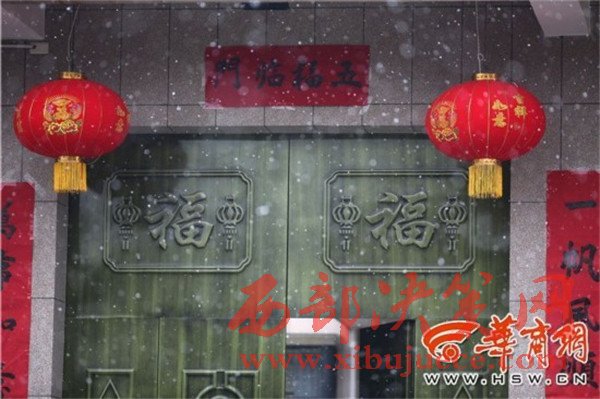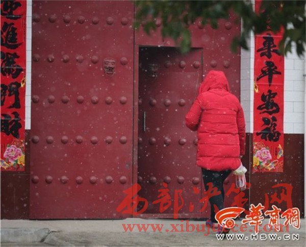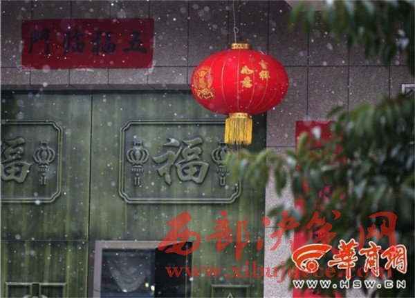 在高陵區(qū)一家農(nóng)戶門口,瑞雪與燈籠、對聯(lián)相應(yīng),也有了過年的氣氛。