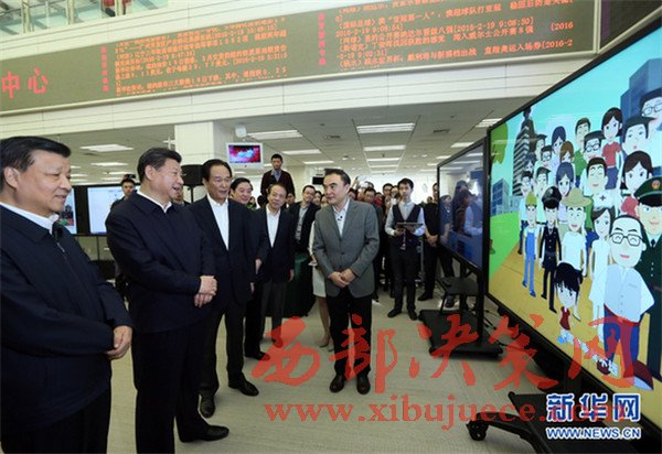2016年2月19日,中共中央總書記、國家主席、中央軍委主席習(xí)近平在北京主持召開黨的新聞輿論工作座談會,并到中央新聞單位調(diào)研。這是習(xí)近平在新華社觀看新聞信息產(chǎn)品展示。新華社記者蘭紅光攝
