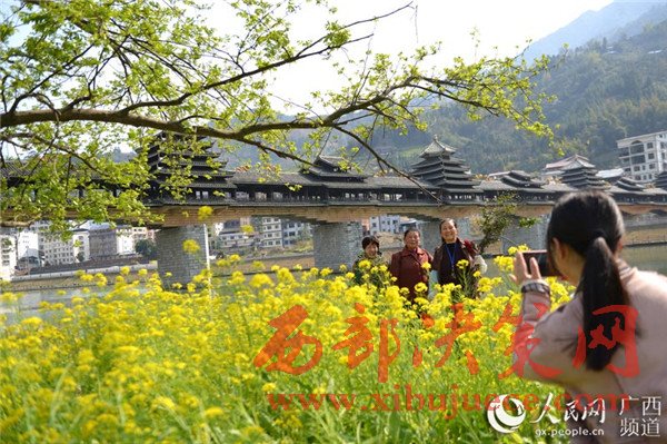 春暖花開時(shí)節(jié),廣西龍勝各族自治縣民族風(fēng)雨橋旁的油菜花競相綻放,風(fēng)雨橋在油菜花的點(diǎn)綴下美不勝收,形成了一道美麗的春天景致,充滿著濃郁的春天氣息,吸引眾多游客前來觀賞拍照。