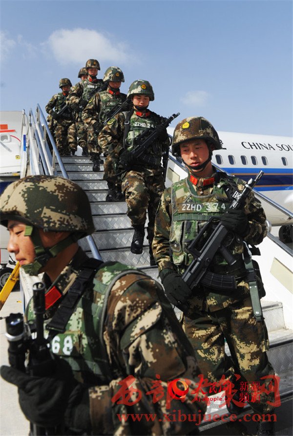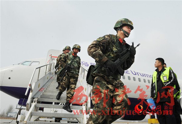 參加反恐維穩(wěn)誓師大會的武警官兵到達(dá)喀什機場,向任務(wù)區(qū)進(jìn)發(fā)。