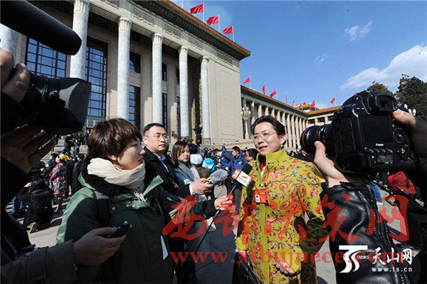 3月5日,新疆全國(guó)人大代表古麗努爾·買買提在北京人民大會(huì)堂前接受媒體采訪。