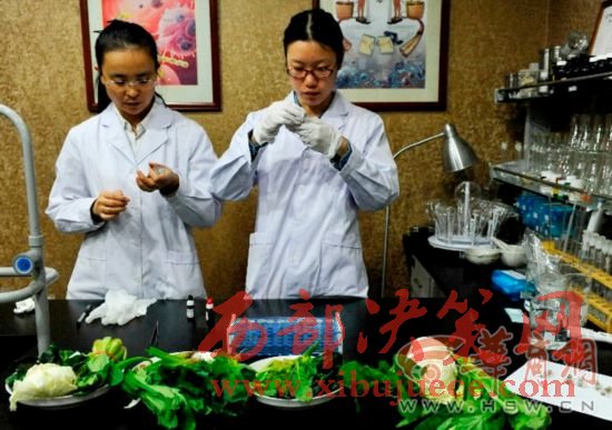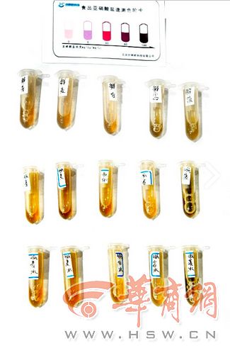 華商報記者在市場上購買了新鮮的菠菜,白菜,小白菜,油麥菜,青菜,拿到西安營養(yǎng)學(xué)會,專家通過實(shí)驗的方法,檢測新鮮蔬菜、冰箱存放48小時的蔬菜、常溫存放48小時的蔬菜中亞硝酸鹽含量的變化。