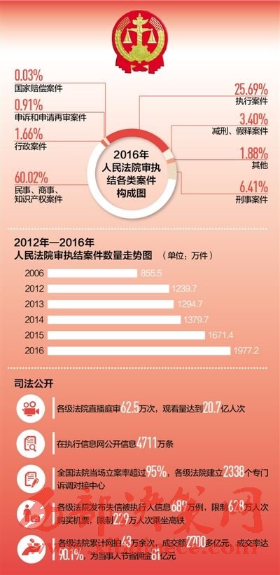 2016年,各級(jí)法院向執(zhí)行難全面宣戰(zhàn),共受理執(zhí)行案件614.9萬(wàn)件,執(zhí)結(jié)507.9萬(wàn)件,同比分別上升31.6%和33.1%,執(zhí)行到位金額1.5萬(wàn)億元,同比上升54%。與公安部等10多個(gè)部門(mén)建立網(wǎng)絡(luò)執(zhí)行查控系統(tǒng),執(zhí)行法官足不出戶即可依法查詢被執(zhí)行人財(cái)產(chǎn)和相關(guān)信息,實(shí)現(xiàn)了執(zhí)行模式的根本變革。發(fā)布失信被執(zhí)行人信息689萬(wàn)例,限制628萬(wàn)人次購(gòu)買機(jī)票,限制229萬(wàn)人次乘坐高鐵。依法懲治拒不執(zhí)行裁判行為,司法拘留1.6萬(wàn)人,追究刑事責(zé)任2167人,讓司法裁判真正成為懲治違法失信的利劍。
