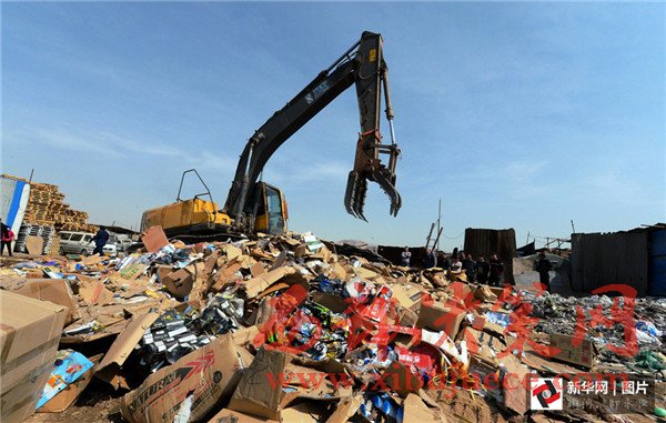 3月14日,在寧夏寧東垃圾填埋場,工作人員將假冒偽劣商品進(jìn)行填埋處理。“3·15”國際消費(fèi)者權(quán)益日即將到來之際,銀川市市場監(jiān)督管理局集中展示并銷毀食品、藥品、電器等32個類別的假冒偽劣商品。