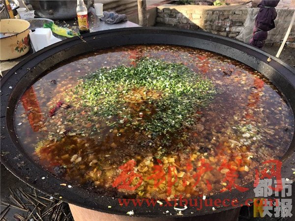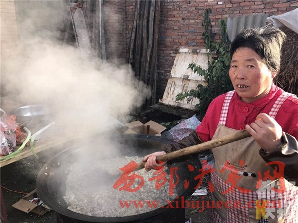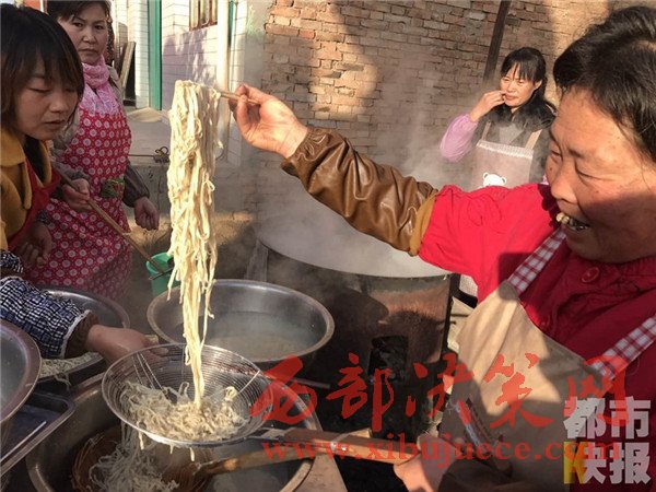 12月4日, 戶縣渭豐鎮(zhèn)元二村,村民們正在興高采烈的烹制著美味大餐,熱鬧非凡,頗有一種過大年的氣氛。熱氣騰騰的臊子面出鍋了,這第一碗面當(dāng)然要親手端給今天這場特殊宴會的主角——百歲老人段奶奶。