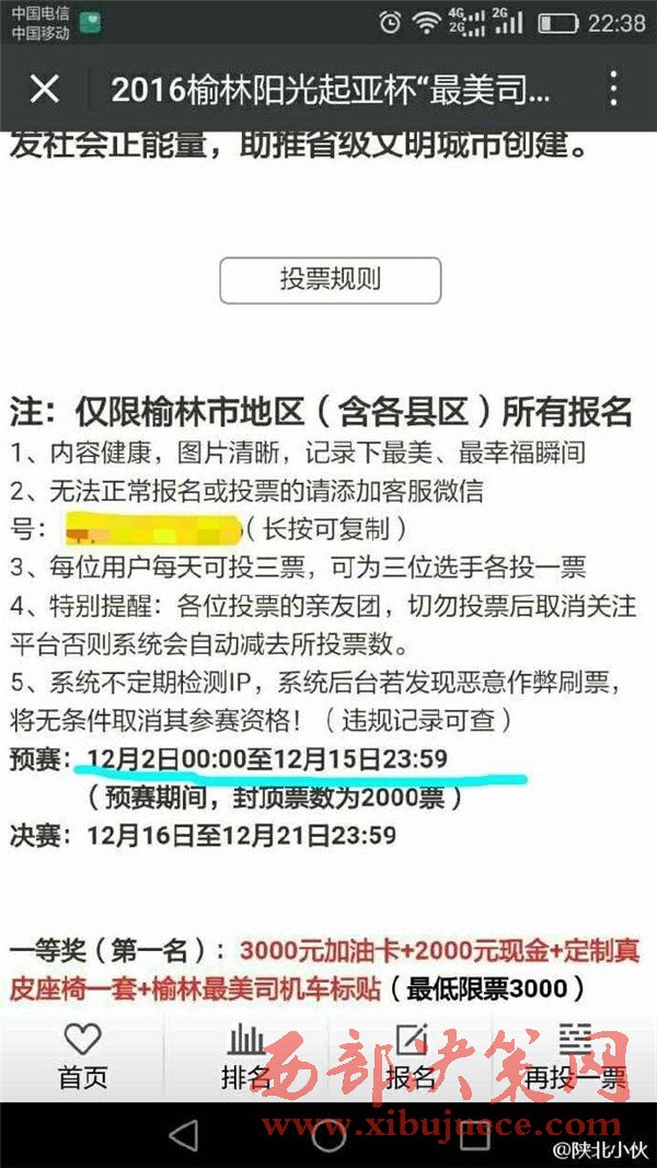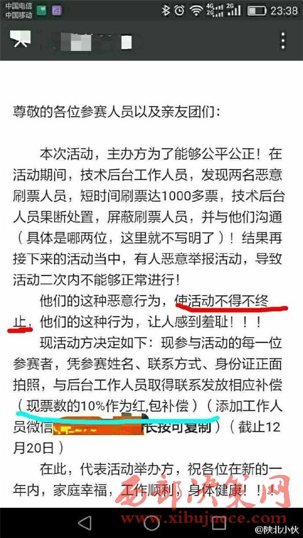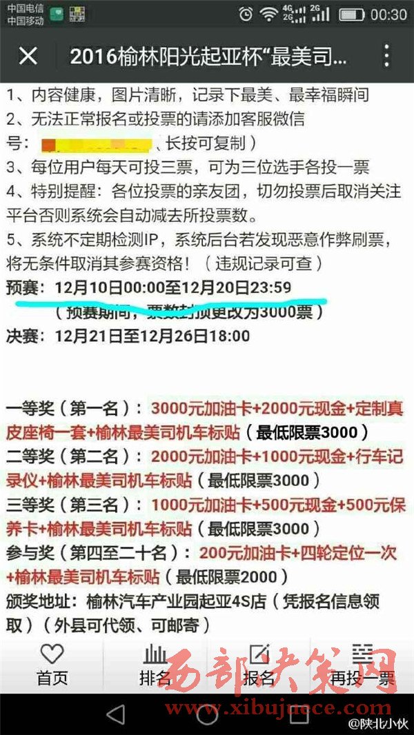 2016年12月初,榆林陽光汽貿通過某公眾號發(fā)起2016榆林陽光起亞杯“最美司機”評選活動,活動設置了豐厚了獎品作為獎勵。并組織全民參與評選活動的投票行為。至此,在榆林眾多市民的朋友圈都發(fā)起了轉發(fā)拉票行為。然而,此次拉票行為卻不斷變更投票時間和決賽時間。近日,某公眾號發(fā)布信息,聲稱陽光汽貿組織的“最美司機”活動取消,并給予相應的票數(shù)補償。此行為卻引起眾多市民的質疑,認為陽光汽貿是在“消遣”參與投票的近萬名市民,從而變相成廣告推銷行為。究竟陽光汽貿是心疼評選活動的獎品發(fā)放,還是一種涉嫌商業(yè)的欺詐行為,請@榆林工商 ,根據(jù)《消費者權益保護法》予以重查重處。