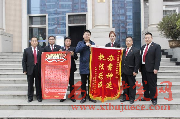 西部決策網訊(帥華鋒 劉恒)3月20日上午,鳳翔大千汽車租賃有限公司總經理王某專程送來 “辦案神速 執(zhí)法為民”的錦旗與感謝信,向鳳翔法院執(zhí)行一庭干警王宏斌及執(zhí)行局全體干警表達謝意,感謝他們在辦案中不辭辛苦,公正執(zhí)法,有力的維護了當事人合法權益。