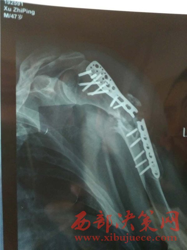 在當時的手術當中院方告知患者手術中采用的是鈦合金鋼板,當時的報價為15800元,術后未發(fā)現什么異常故住院18天后出院。時隔1年半到2016年年底,來到榆林星元醫(yī)院準備拆鋼板時,通過XT片后發(fā)現鋼板是斷裂的,固定鋼板的13個鋼釘也全部斷裂,肱骨也未長好,所以不得不再進行二次手術,將原來的鋼板拆除,再做一次手術,再一次將19個鋼釘打在了自己的左胳膊上。